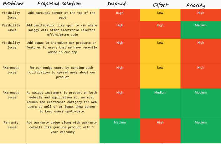 On the basis of impact-effort analysis and For a quick solution integration, I am assuming Solution 1( adding carousel banner), (adding popup ) from the visibility issue. From awareness issue, taking push notification as solution 2. The rest solutions will be considered once we get the result from the above solution in the iteration or re-iteration phase.